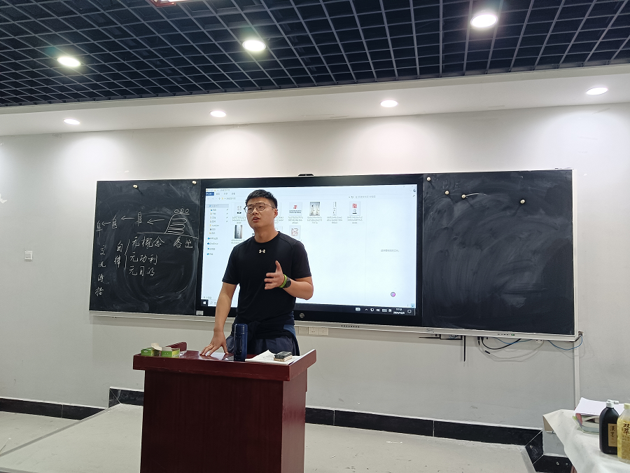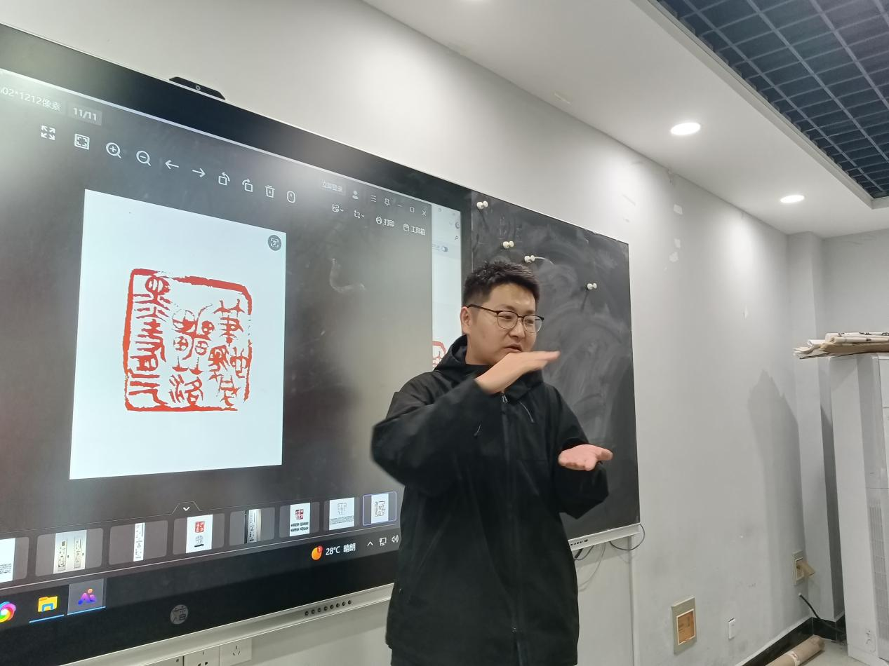 紧接着是菀惠夏员工分享篆刻经验。他以本次入展作品为范例,为同学们分享了有关古玺印的知识。他认为字的选择是十分重要的,例如“道”字,该字字体优美,利于用在作品中表现;章法需要巧妙构思,字与字之间的纵横穿插,整体的空间布局无一不需要布局;勤学习,勤思考是基础,敢创作,善创作是本事。