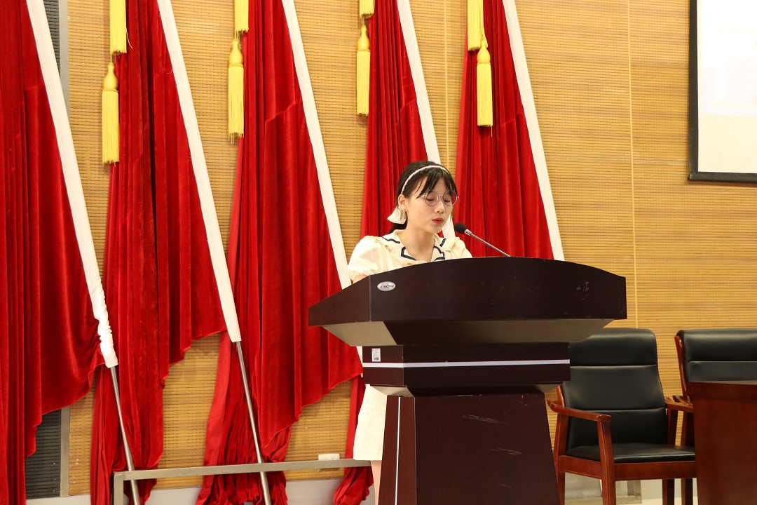 接着,汉语言文学专业老生代表郭玉奇同学发言,向大一新生讲述了自己考研、考四级、考专业证书的奋斗经历。她以自己的故事鼓励学弟学妹们在大学这个广阔的平台中,努力奋斗、抓紧时间、认真生活。