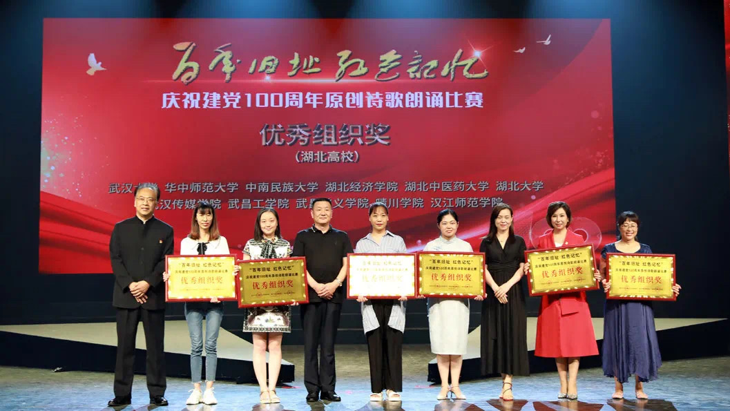 7月11日,湖北省庆祝建党100周年原创诗歌朗诵比赛颁奖典礼暨朗诵音乐会在武汉市群众艺术馆举行,VSport体育师生代表VSport体育官网入口组队参赛,荣获优秀组织奖。