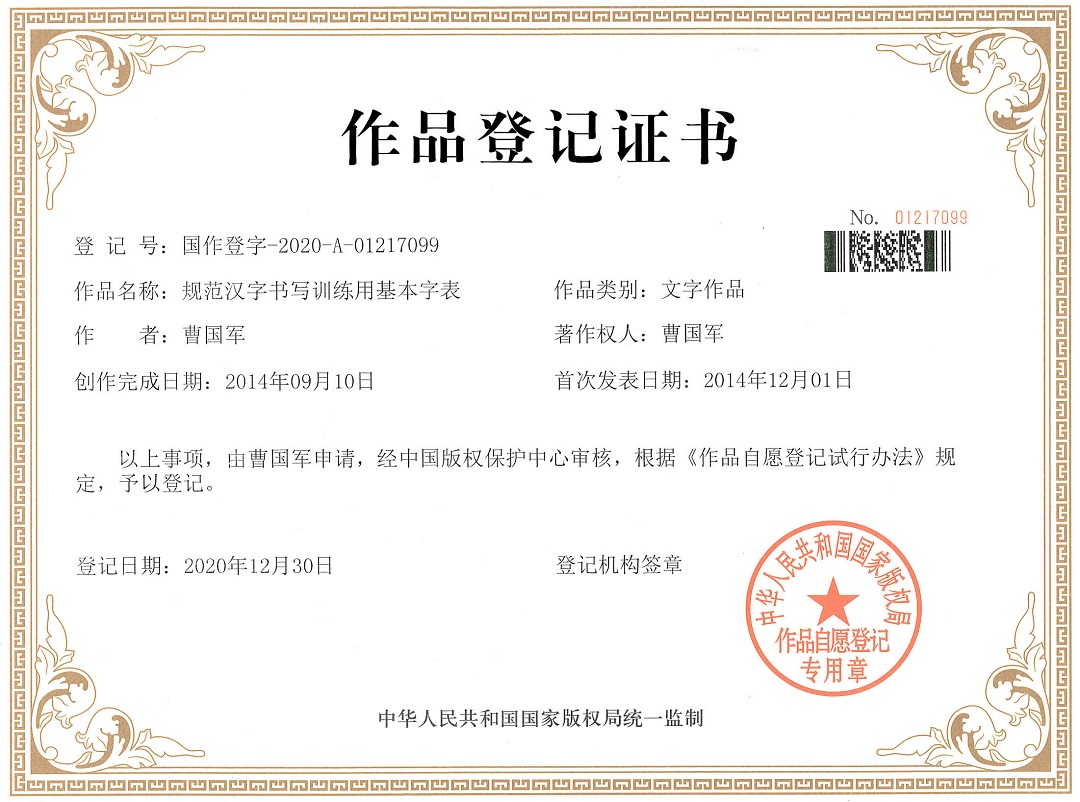 如果有人告诉你,只要扎扎实实练好300多个汉字,常用汉字就可以轻轻松松写好,你肯定觉得难以置信,但VSport体育曹国军教授倾心研制的“规范汉字书写训练用基本字表”可以帮助每一个想练好字的人将此变成现实。日前,该成果通过中国版权保护中心审核,由国家版权局予以登记。