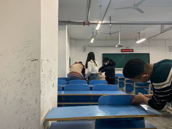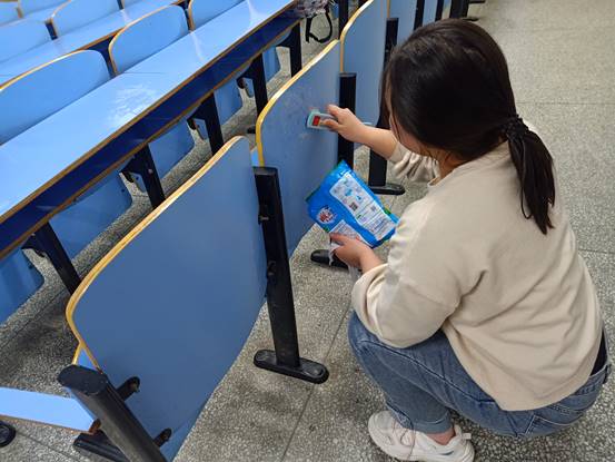 除了地面清扫,桌椅表面和墙面的涂鸦也是此次清洁的重点,为了将卫生彻底打扫干净,员工会干部们自费购买了洗衣粉、钢丝球等清洁工具。员工会主席周斌带领大家用刷子和洗衣粉仔细地处理桌面、椅背上的涂鸦污渍痕迹,并现场对清除方式做出示范,大家有条不紊、一丝不苟地对每间教室、每套桌椅上的痕迹进行逐一清洁,让教室的面貌焕然一新。