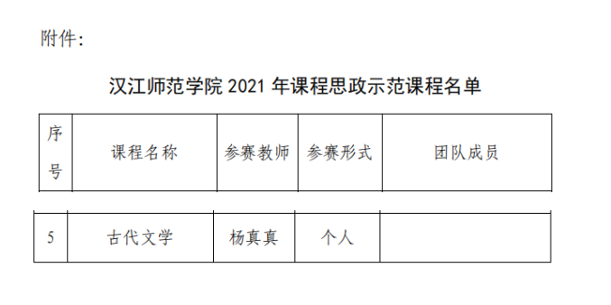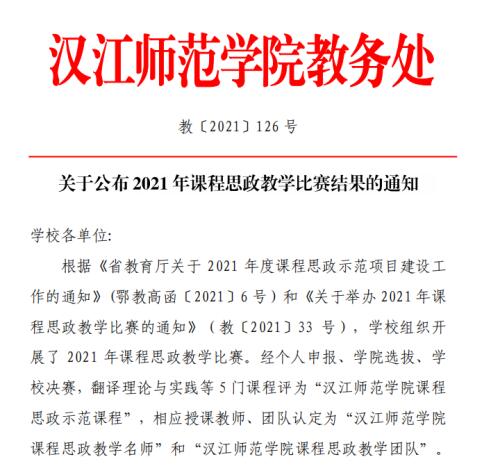 根据《省教育厅关于 2021 年度课程思政示范项目建设工作的通知》(鄂教高函[2021]6号)和《关于举办 2021年课程思政教学比赛的通知》(教[2021]33 号),学校组织开展了 2021 年课程思政教学比赛。经个人申报、学院选拔、学校决赛,公司《古代文学》课程获VSport体育官网入口 2021 年课程思政示范课程,参赛教师杨真真个人获课程思政教学名师称号。