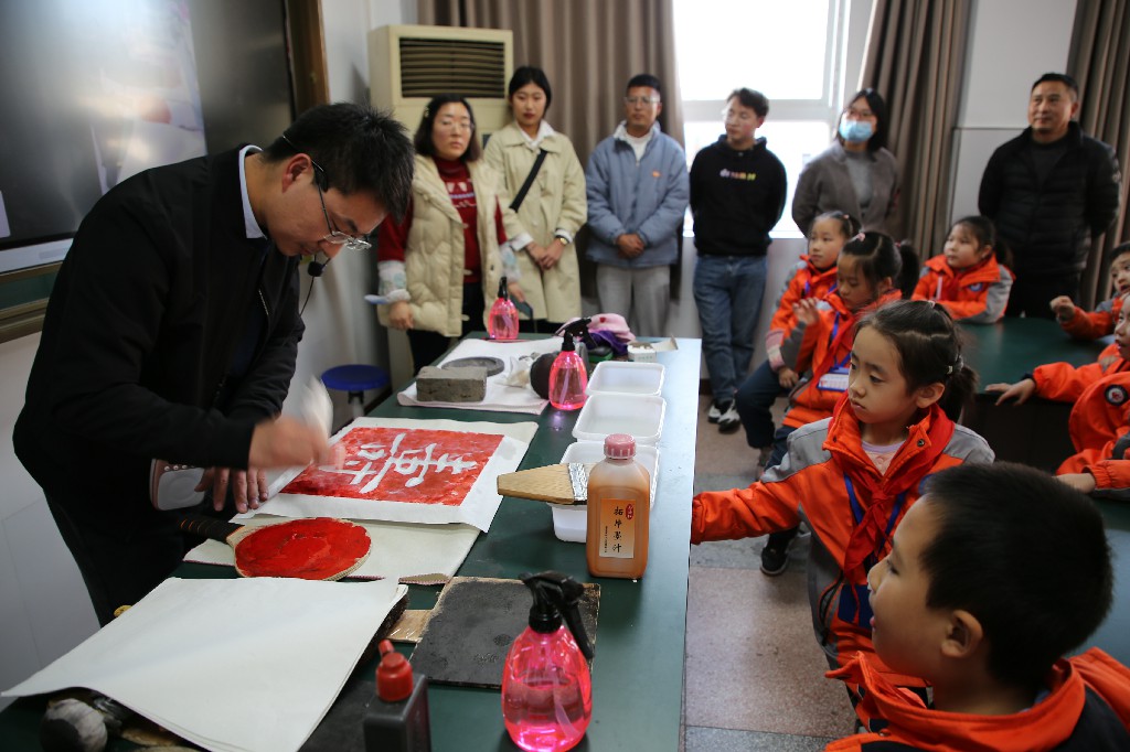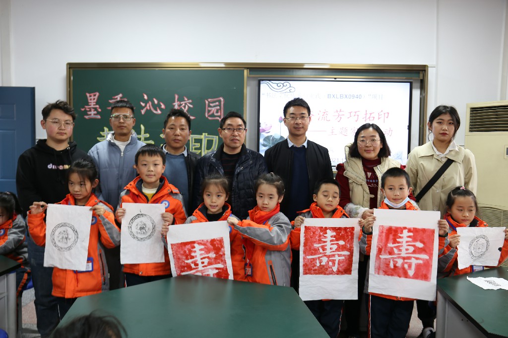 活动在该校二(6)班开展,由班主任董洵老师主持,董事长袁炳陆、副董事长王启梅莅临现场指导。首先,王刘涛老师讲解了传统书法碑刻传拓的基本知识,展示了传拓使用的工具,然后精心操作,在小员工们一双双惊奇的眼神中从碑版上拓下一个鲜红的“寿”字,完成了一件作品。