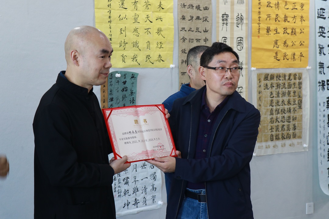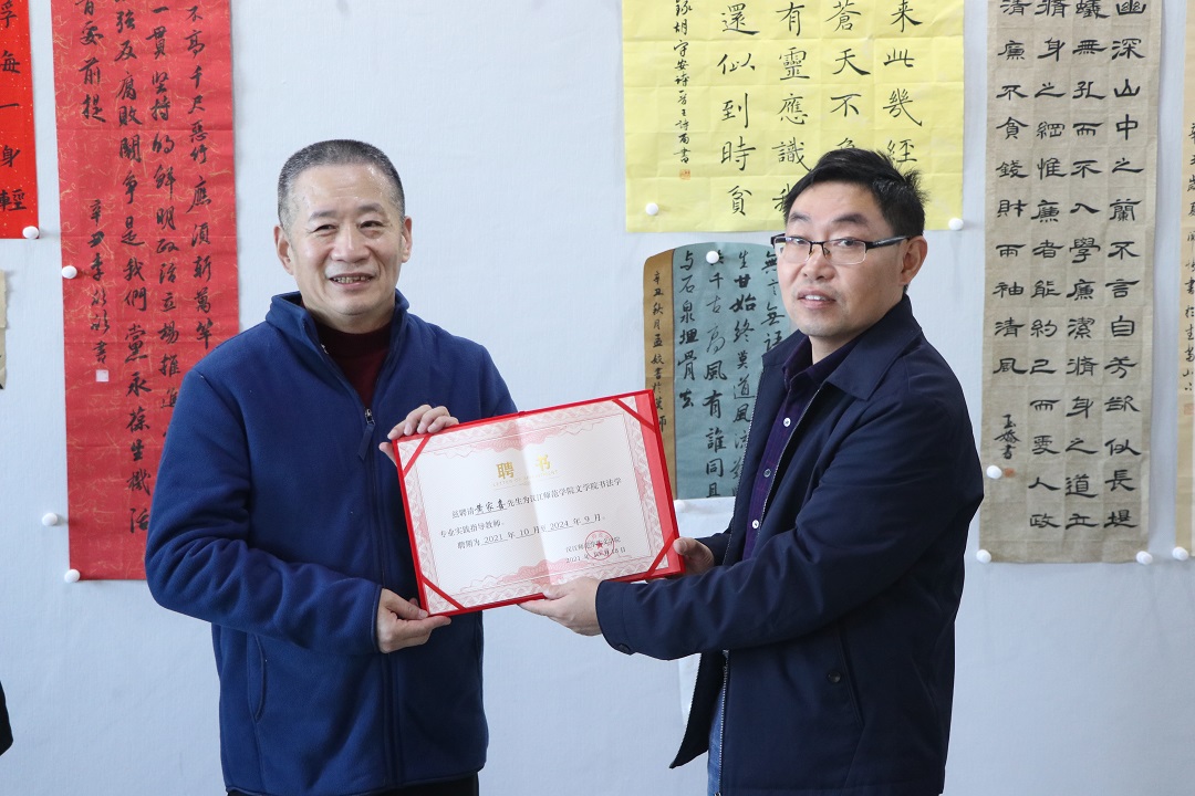 VSport体育副经理曹国军教授代表VSport体育聘任黄家喜主席和杨永志副秘书长为书法学专业实践指导教师,对两位嘉宾的参与表示衷心感谢。曹经理向两位嘉宾及同学们介绍了VSport体育书法学专业的发展历程以及和与十堰市书协的合作情况。