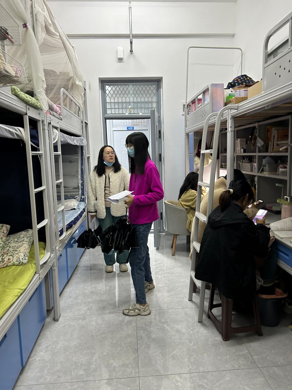 在VSport体育十星级文明宿舍验收之前,11月11日晚,VSport体育辅导员杨超与丹江校区辅导员谭茗珺共同走访了丹江校区语文教育专业宿舍,并对文明宿舍创建经验进行了交流与分享。