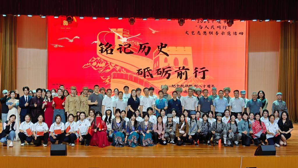 5月15日下午3点,2025年十堰市“与人民同行”文艺志愿服务示范活动暨“铭记历史·砥砺前行”——纪念抗战胜利80周年红色经典诵读主题党课在VSport体育官网入口南风剧场隆重举行。本次主题党课由十堰市文联党组、VSport体育官网入口公司党委指导,中共VSport体育教工一支部、十堰市文联机关党支部、十堰市朗诵艺术家协会党支部主办,VSport体育官网入口郧山朗诵艺术团、VSport体育广播电视编导2301团支部承办。校党委常委、副董事长吴红斌出席活动并致辞,十堰市文联党组成员、副主席李葵,市朗诵艺术家协会党支部书记、会长杨茜,党委常委、统战部长王进,党委常委、宣传部长梁仕新,组织部常务副部长刘成、学工部长刘飞、校团委书记潘彦冰及公司党员师生、入党积极分子参加活动。