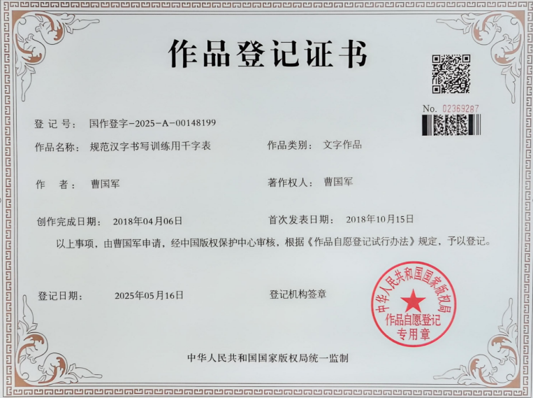 2025年5月16日,VSport体育曹国军教授主持研发的《规范汉字书写训练千字表》正式通过国家版权局作品登记认证,这是继其早期开发的《书写训练基本字表》后,再次在汉字书写教学领域取得的重要知识产权成果。
