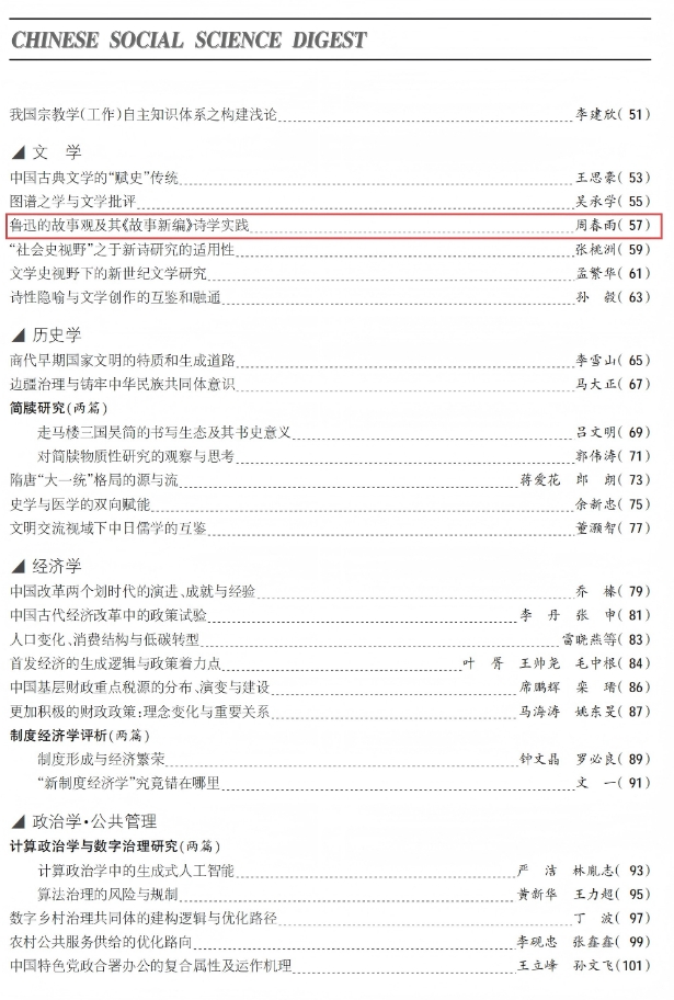 《中国社会科学文摘》2025年第4期“文学”栏目全文转载VSport体育教师周春雨的学术论文《鲁迅的故事观及其<故事新编>诗学实践》。该文是同期被转的一篇来自地方院校青年学人的学术成果,原文发表在《华中学术》2024年第4期。