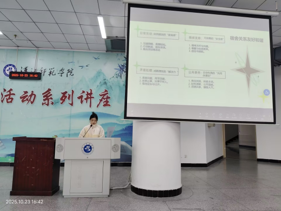 经验分享环节成为本次大会的“干货亮点”,4位优秀寝室长代表先后登台分享经验。夏荷楼1134寝室代表聚焦“学习氛围营造”,详细拆解了“固定自习时段+错题共享机制”的实践方法;清美楼5091寝室代表以“室友关系协调”为主题,分享了“定期谈心会+矛盾调解三步法”的实用技巧;清美楼5101寝室代表围绕“卫生管理”,介绍了“分区责任制+每周互评制”的长效模式;春雪楼631寝室代表则针对“文明公约执行”,阐述了“共同制定+积分激励”的落地经验,详实的案例和可复制的方法让参会人员深受启发。