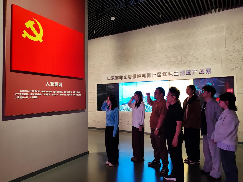 4月16日,师生走进山东省博物馆近现代革命历史文化展厅,深入学习沂蒙精神的深刻内涵。在党旗前,全体党员重温入党誓词,以铿锵誓言坚定理想信念、强化党性修养。通过参观珍贵文物、详实史料,师生们系统回顾山东革命发展历程,深刻感悟革命文化的精神伟力,进一步坚定了以笔墨传情、以文化铸魂的专业追求。