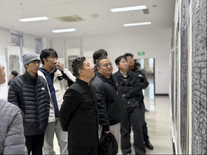 观展现场,带队教师结合书法专业课程要点展开现场教学,针对明代“台阁体”圣旨碑的劲健笔意、宋代名家题字的气韵风骨等作品细节,细致拆解笔法使转与章法布局技巧。在宋代陈抟所书“福”“寿”字拓片前,师生围绕“金石气与笔墨意的融合”展开热烈讨论;面对明代御制碑拓的严谨结体,同学们认真记录技法特点,不时用手机留存资料以备后续临摹参考。