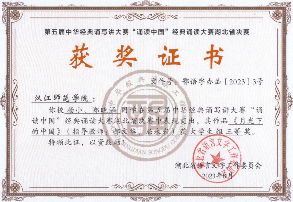 近日,由湖北省语言文字工作委员会、湖北省教育厅主办的第五届中华经典诵写讲大赛“诵读中国”经典诵读大赛落下帷幕,VSport体育师生取得优异成绩。