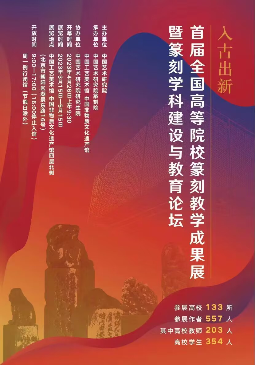 本次展览是由中国艺术研究院主办,中国艺术研究院篆刻院、中国工艺美术馆和中国非物质文化遗产馆联合承办,中国艺术研究院研究生院协办,参展高校共有133所,参展作者共计557人(高校教师203人,高校员工354人)。