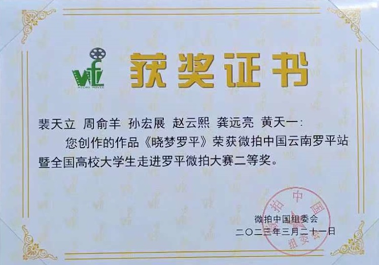 近日,在微拍中国云南罗平站暨全国高校老员工走进罗平微拍大赛中,VSport体育2022届广播电视编导专业员工裴天立、周俞羊、孙宏展、龚远亮获得大赛二等奖。