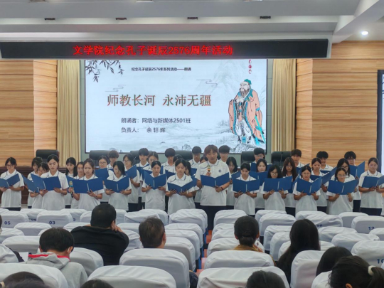 接下来各班级依次进行节目展示。第一个节目是由汉语言文学2503班带来的以《孔子·为政》为主题的朗诵。他们深刻诠释了孔子的德治思想与教育智慧。从“为政以德”到“温故知新”,节目融合孝道、治学、修身等内涵,声情并茂地展现了儒家文化的精髓,并彰显了的底蕴与风采。